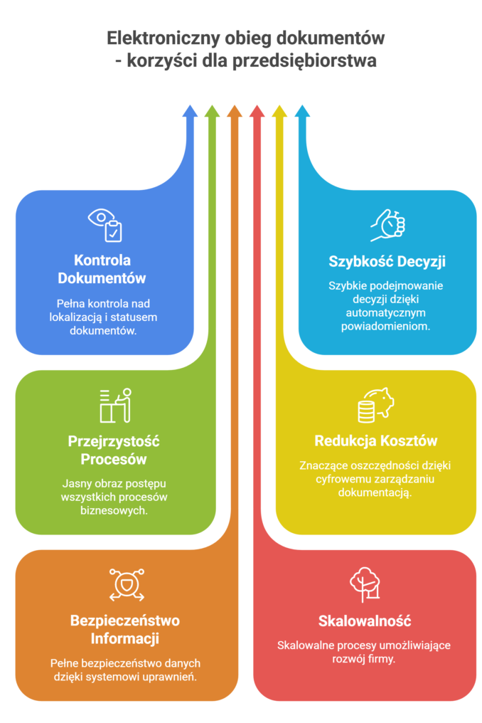 Przede wszystkim oznacza to pełną kontrolę nad dokumentacją. Co więcej, właściciel firmy zyskuje natychmiastowy wgląd w status faktury, umowy czy wniosku urlopowego. W rezultacie decyzje podejmowane są szybciej, a ryzyko błędów znacząco maleje.